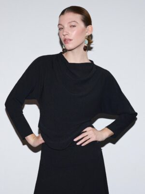 A sophisticated black fluid top featuring statuesque wraparound architectural lines and a refined provocative back zip creative profile.