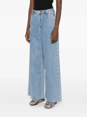 A creative light blue denim featuring statuesque wide leg detailing and a refined provocative frayed creative profile.