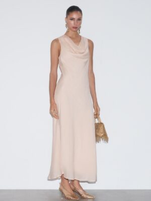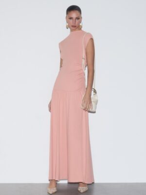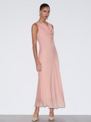 A creative pink midi dress featuring statuesque waterfall architectural detailing and a refined provocative flared profile.