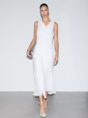 A statuesque white midi dress featuring architectural waterfall neckline tailoring and a refined provocative flared creative silhouette.