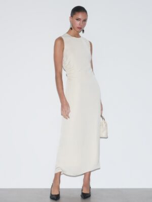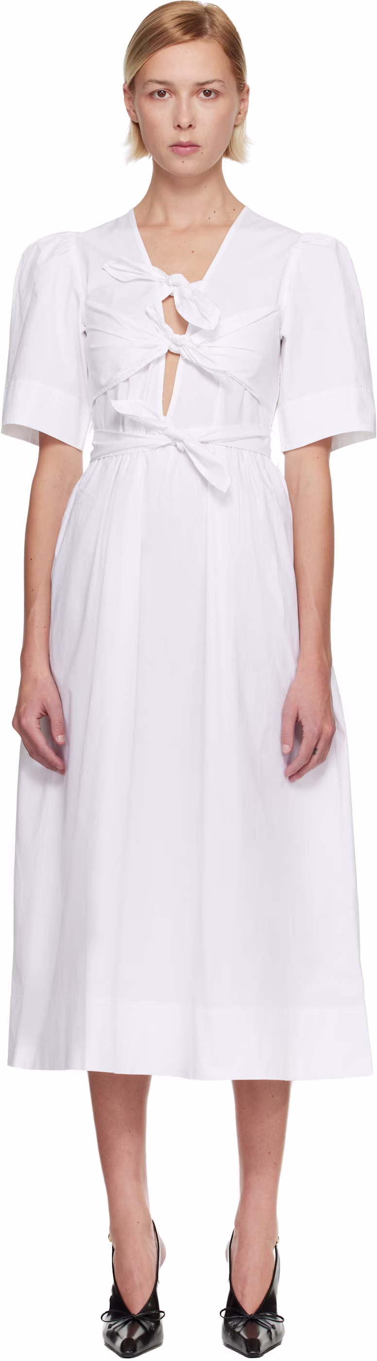 A statuesque off white midi dress featuring architectural poplin skirt tailoring and a refined provocative elastic waist creative silhouette.