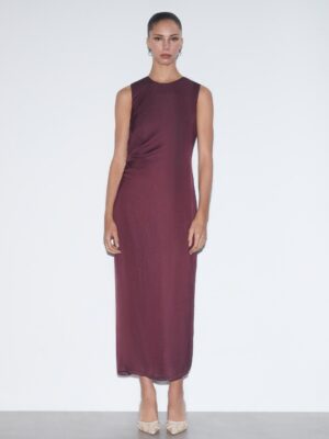 A statuesque burgundy midi dress featuring architectural back split tailoring and a refined provocative textured creative silhouette.