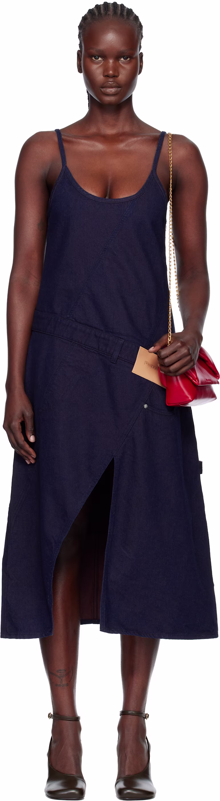 A sophisticated navy dress featuring statuesque denim lines and a refined provocative utility creative profile.