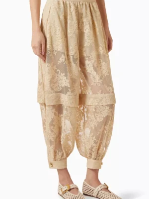 A sophisticated ivory trouser featuring statuesque lace lines and a refined provocative gathered creative profile.