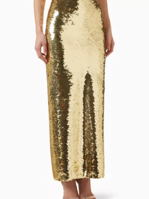 A statuesque gold long skirt featuring architectural sequin embellishments and a refined provocative fluid creative silhouette.