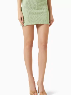 A creative green mini skirt featuring statuesque belted architectural detailing and a refined provocative micro sequin profile.