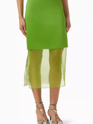 A sophisticated green skirt featuring statuesque crepe satin architectural lines and a refined provocative double layered creative profile.