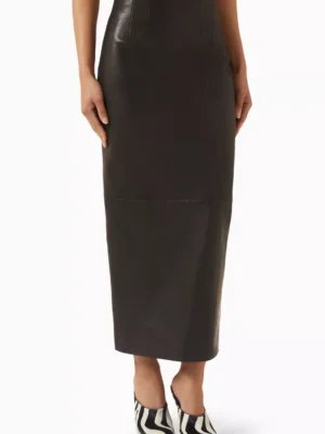 A creative black leather skirt featuring statuesque lambskin architectural detailing and a refined provocative corset dart profile.