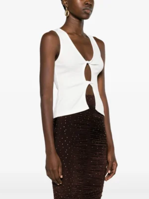 A statuesque white top featuring technical cut out tailoring and a refined provocative twisted creative silhouette.