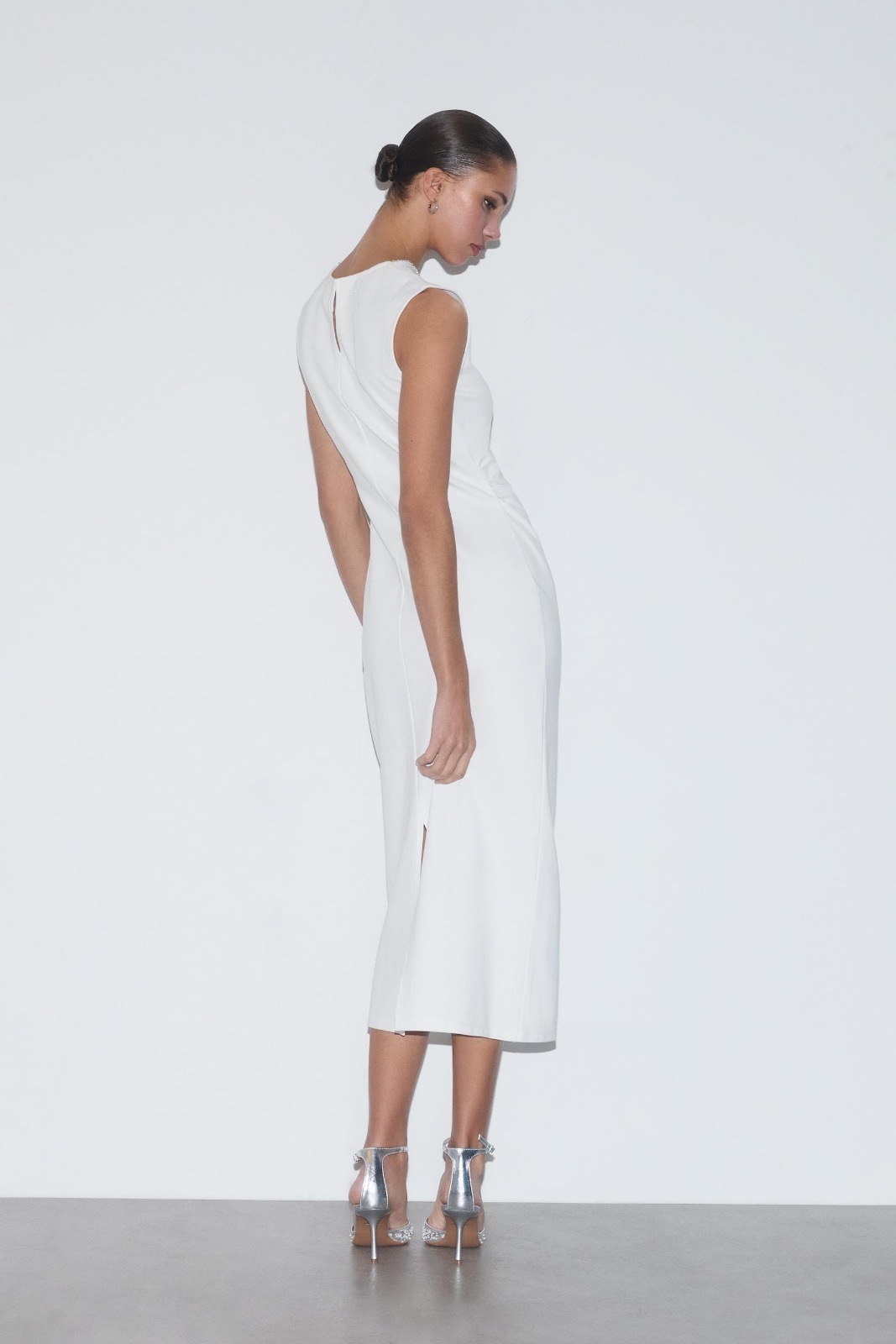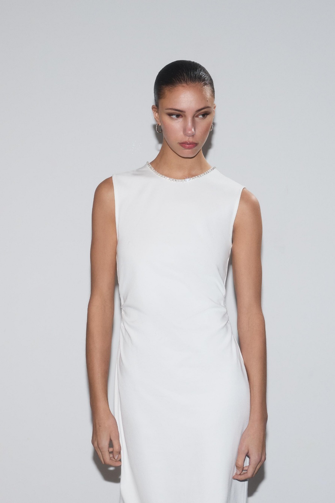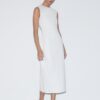 Description: Achieve the peak of effortless high-fashion luxury with the Alabaster Monarch Jewel Dress. Defined by its radiant off-white hue and premium high-fidelity stretchy dress fabric, this piece offers an authoritative and creative take on modern archival gala wear. The architectural design features provocative jewel detailing at the round neckline and structural teardrop button fastenings at the back that flow into a precision-engineered fitted silhouette. Crafted with a statuesque profile and structural integrity, it maintains a sharp aesthetic while the technical jewel finish adds a unique designer dimension. Its bold structural profile serves as a timeless statement of refined luxury for the curated modern wardrobe.