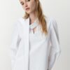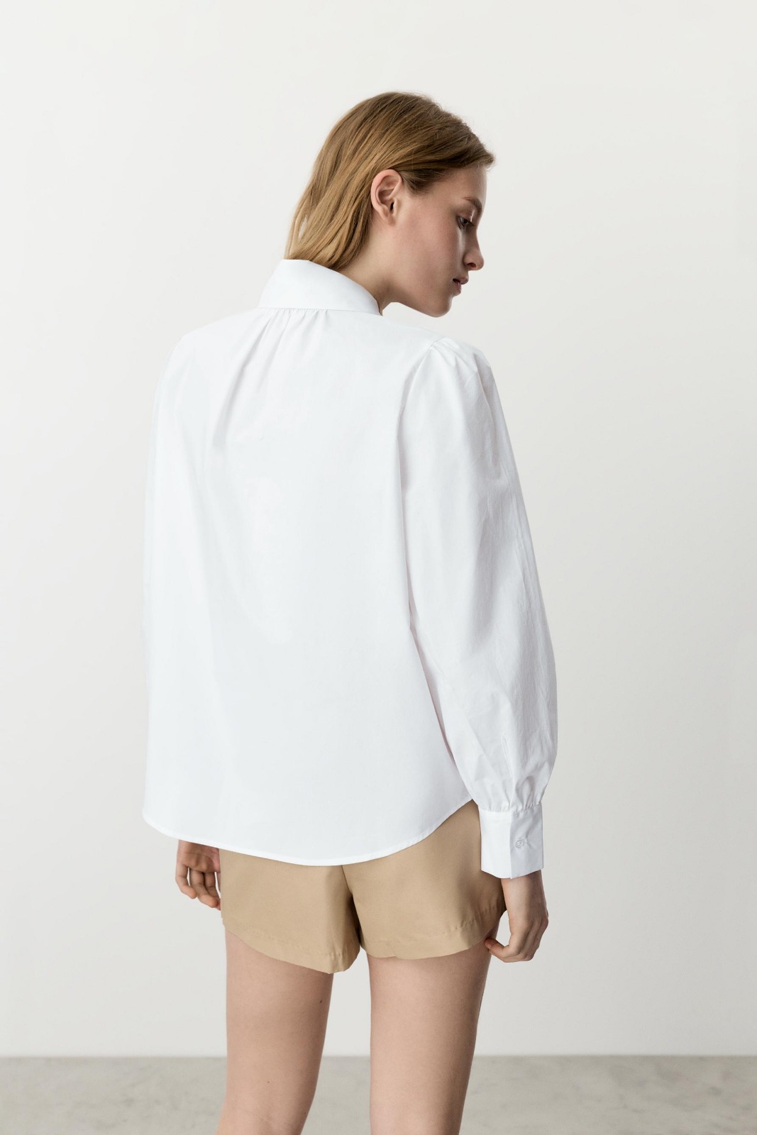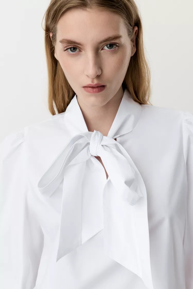 Features: Architectural puff sleeves; Technical bow detail; Structural pointed band collar; High-fidelity textile finish