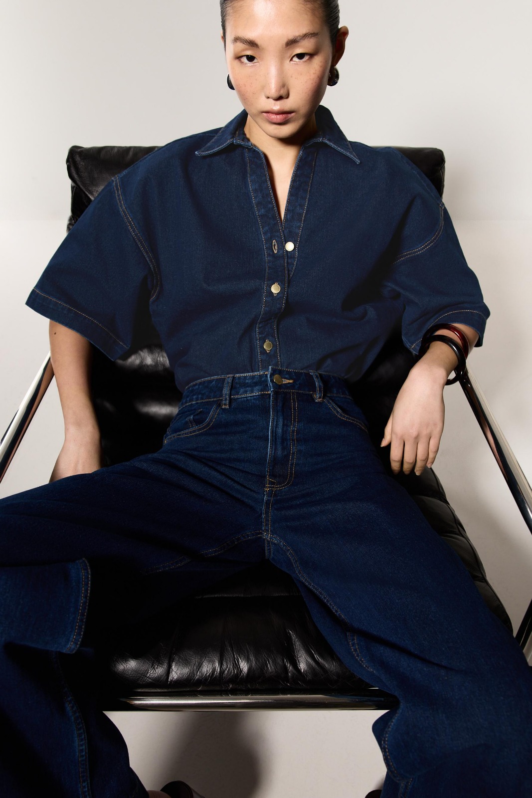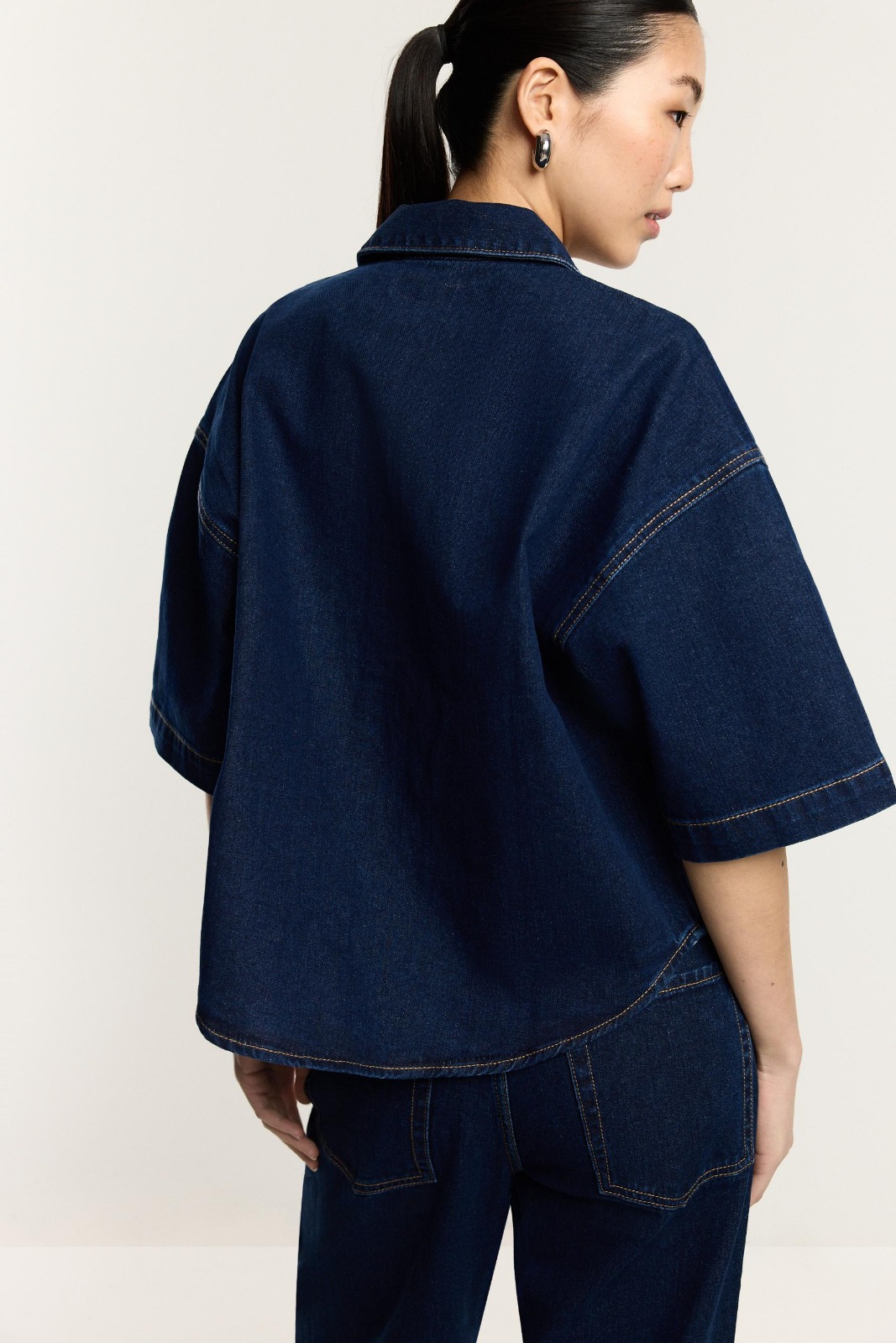 Features: Technical denim weave; Structural long sleeves; High-fidelity wash; Precision tailored collar