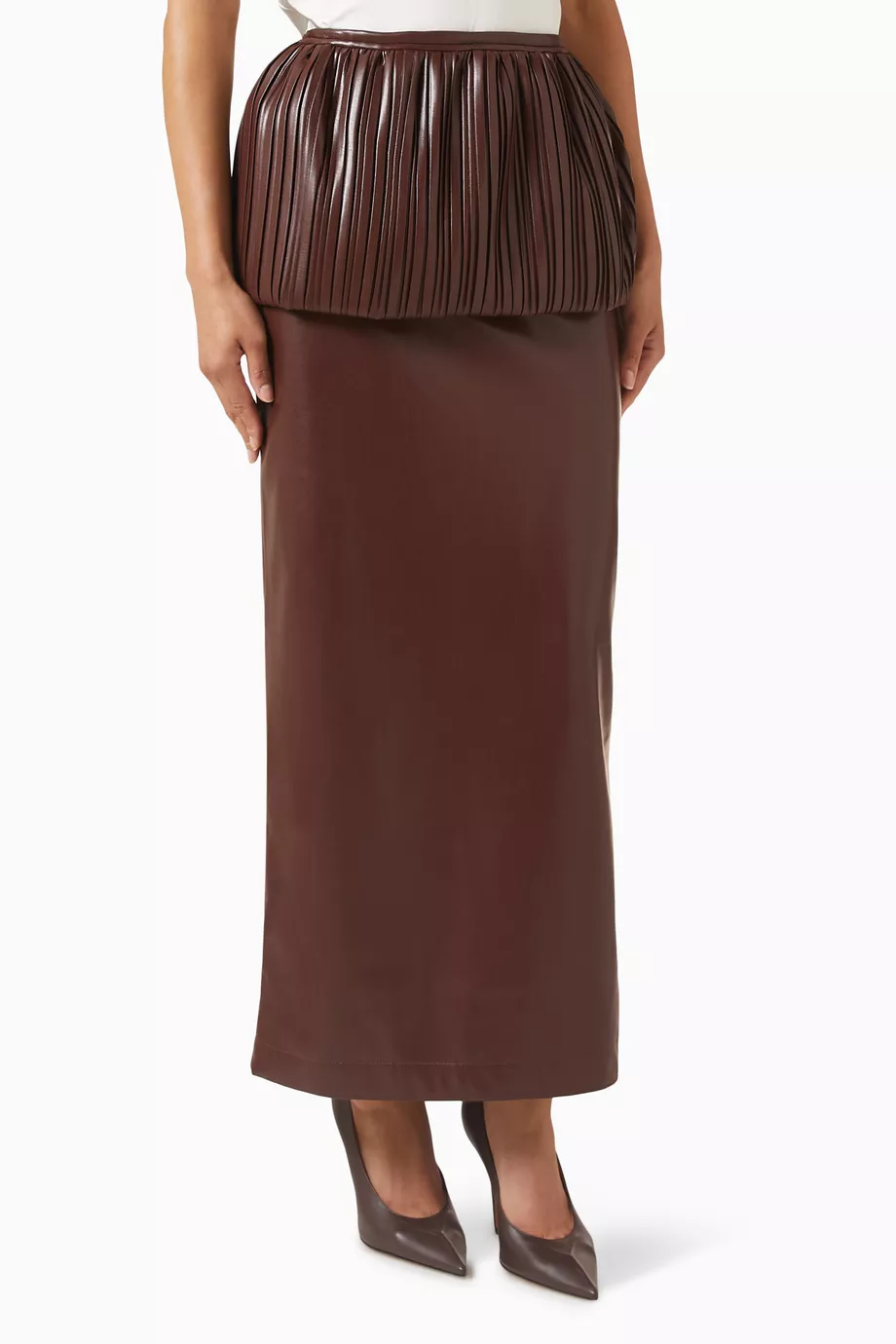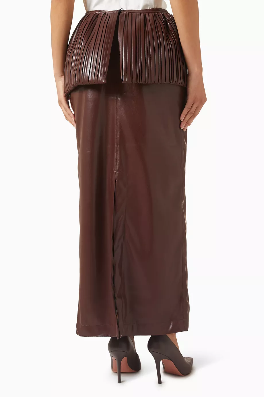 Description: Experience the peak of modern feminine authority with the Cocoa Zenith Maxi Skirt. Defined by its sophisticated brown palette and premium high-density eco-leather, this piece offers a statuesque and creative take on contemporary statement dressing. The architectural construction features provocative sculptural pleats and structural volume that ensures fluid movement while holding its shape. Crafted with structural integrity and a technical high-fidelity finish, it serves as a timeless foundational statement for a curated high-fashion skirts wardrobe. Its bold structural profile transitions effortlessly from day to evening with a confident, polished designer aesthetic.