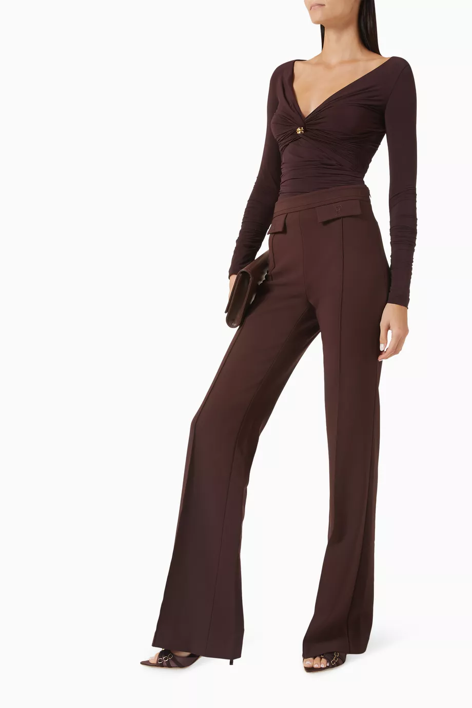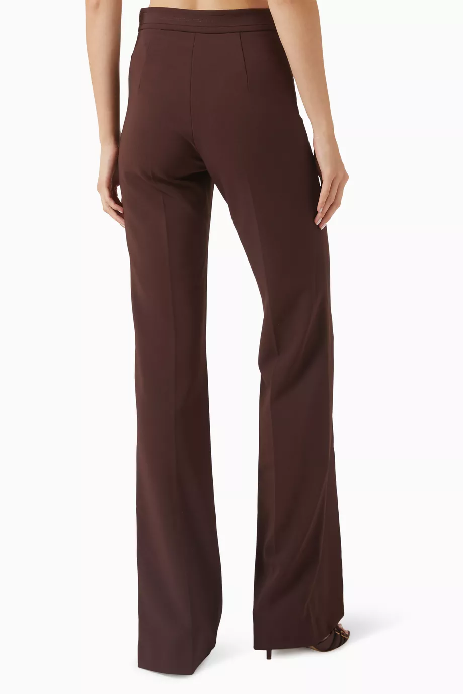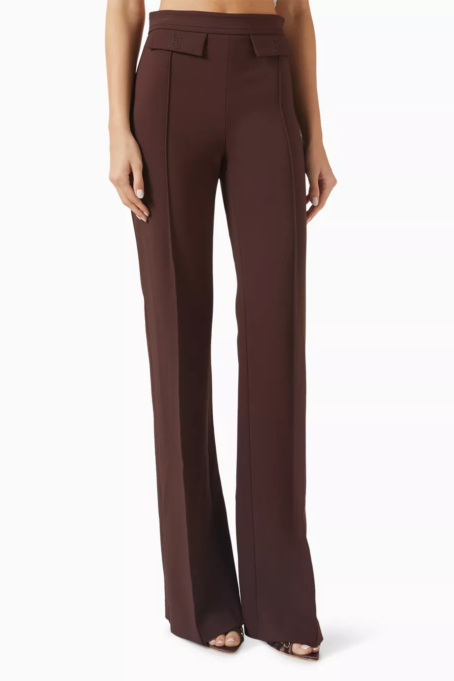 Description: Experience the peak of modern authority with these High-Waisted Flared Crepe Pants. Defined by its sophisticated mahogany palette and premium high-density crepe fabrication this piece offers a statuesque and creative take on contemporary archival shirting. The construction features provocative flared lines and precision-engineered structural logo details that ensure exceptional movement while maintaining a polished designer aesthetic. Crafted with structural integrity it serves as a timeless foundational statement for a curated formal collection. Its bold structural profile provides a perfectly balanced ensemble.