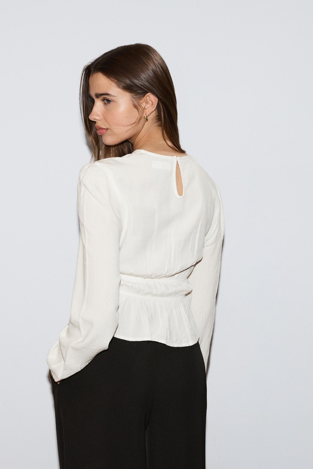 Description: Capture the energetic spirit of modern luxury with the Ecru Archive Textured Blouse. Characterized by its unique architectural silhouette and sophisticated ecru palette, this piece offers a statuesque and creative take on artisanal essential tailoring. The construction features provocative elasticated waist elements and a refined technical teardrop fastening at the back that ensures a polished aesthetic for high-profile social retreats. Crafted from premium high-density textured fabric with structural integrity and a fluid modern profile, it maintains a sharp and authoritative aesthetic while the round neck finish adds a tactile designer edge. Its rich structural dimension serves as a timeless statement of refined luxury for the modern individual who appreciates an artisanal designer edge.