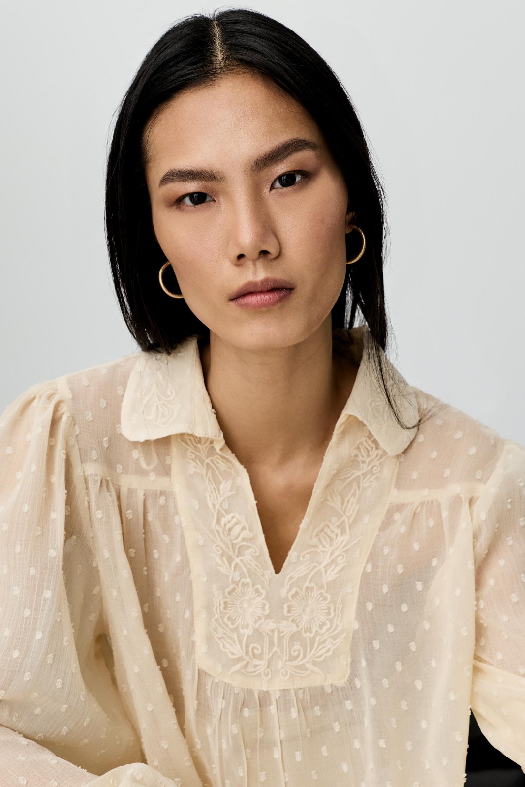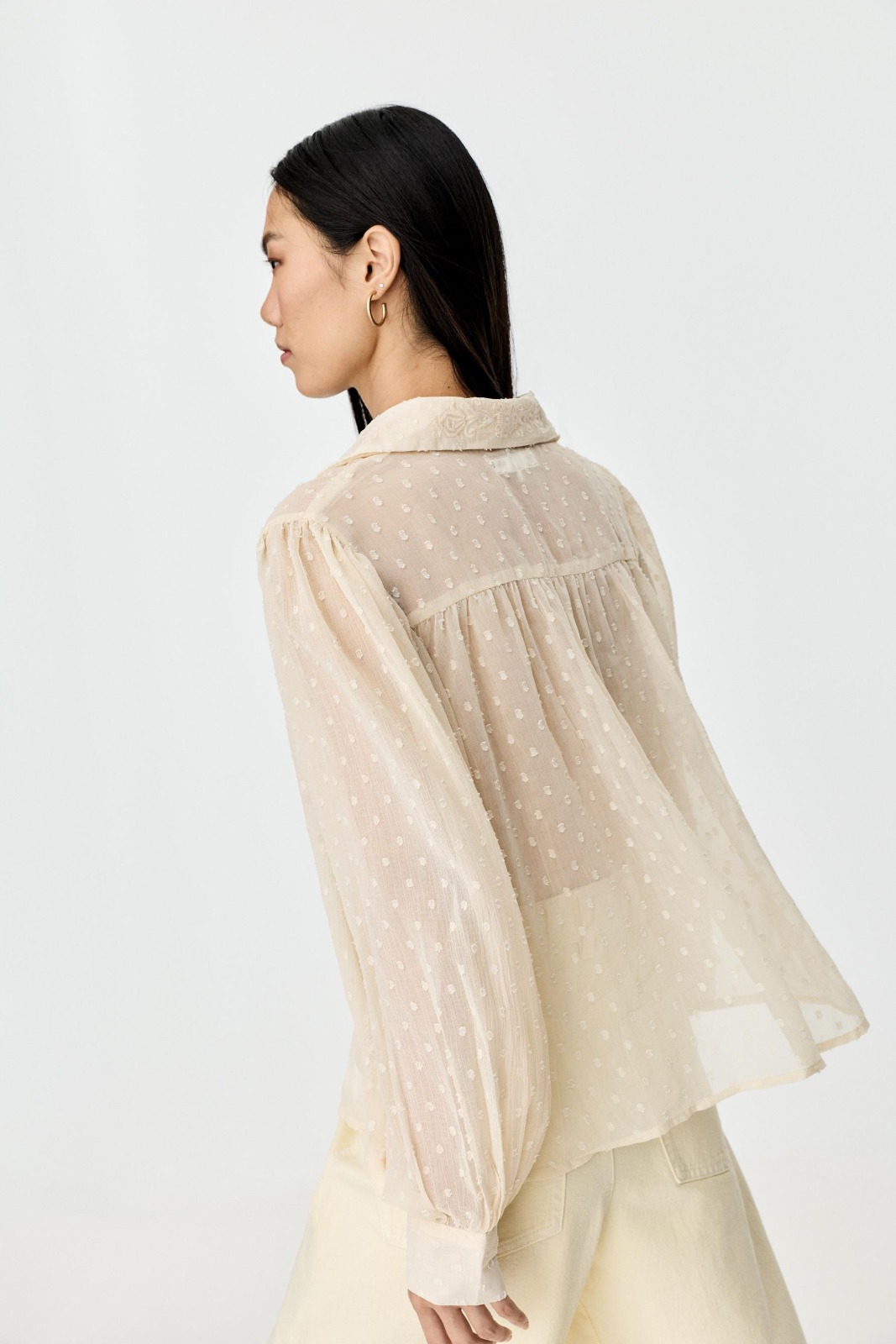 Description: Achieve the peak of effortless luxury with this Dotted Mesh Blouse. Defined by its radiant ivory-toned hue and premium high-fidelity sheer fabrication this piece offers an authoritative and creative take on modern archival evening wear. The design features a provocative puffed-sleeve profile and structural tailoring that flows into a precision-engineered silhouette featuring delicate dotted mesh. Crafted with structural integrity and a technical high-fidelity finish it maintains a sharp aesthetic while the specialized mesh adds a unique designer dimension.