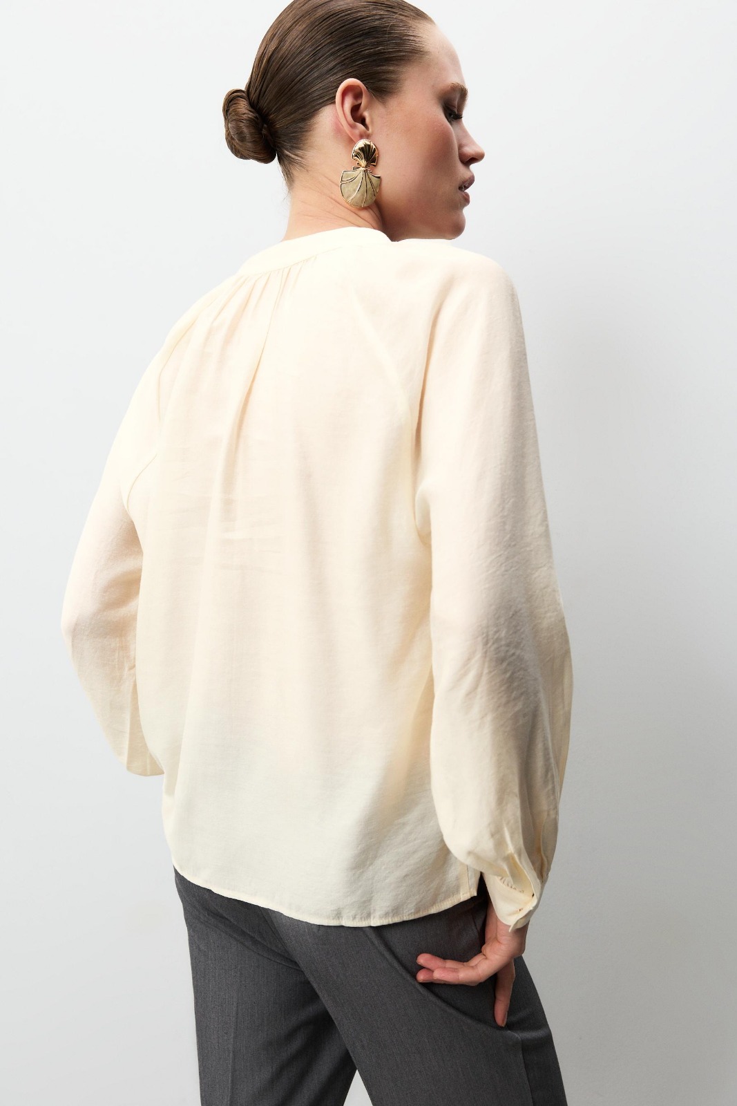 Description: Experience the peak of modern feminine authority with the Ecru Zenith Henley Shirt. Defined by its sophisticated ecru palette and premium high-density fluid fabric, this piece offers a statuesque and creative take on contemporary archival essentials. The architectural construction features provocative long sleeves and a precision-fitted henley neckline with a technical button-up front that ensures exceptional movement while maintaining a polished designer aesthetic. Crafted with structural integrity and a technical loose-cut profile, it serves as a timeless foundational statement for a curated high-fashion blouses wardrobe.