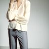 Line dry in the shade and steam gently to maintain the fluid integrity and architectural profile.