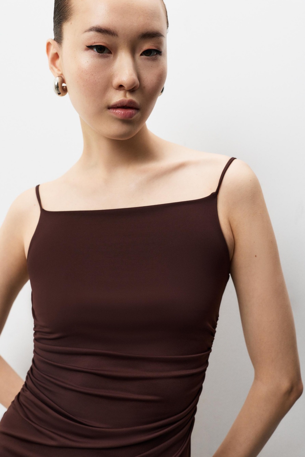 Description: Achieve the peak of effortless high-fashion luxury with the Espresso Monarch Waterfall Dress. Defined by its radiant chocolate hue and premium high-fidelity stretchy polyamide fabric, this piece offers an authoritative and creative take on modern archival gala wear. The architectural design features provocative thin straps and structural waterfall neckline detailing that flows into a precision-engineered fitted silhouette. Crafted with a statuesque profile and structural integrity, it maintains a sharp aesthetic while the technical polyamide finish adds a unique designer dimension.