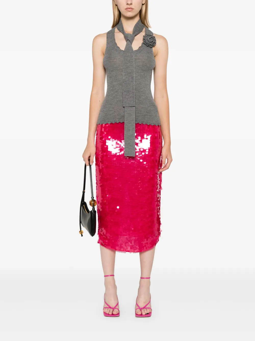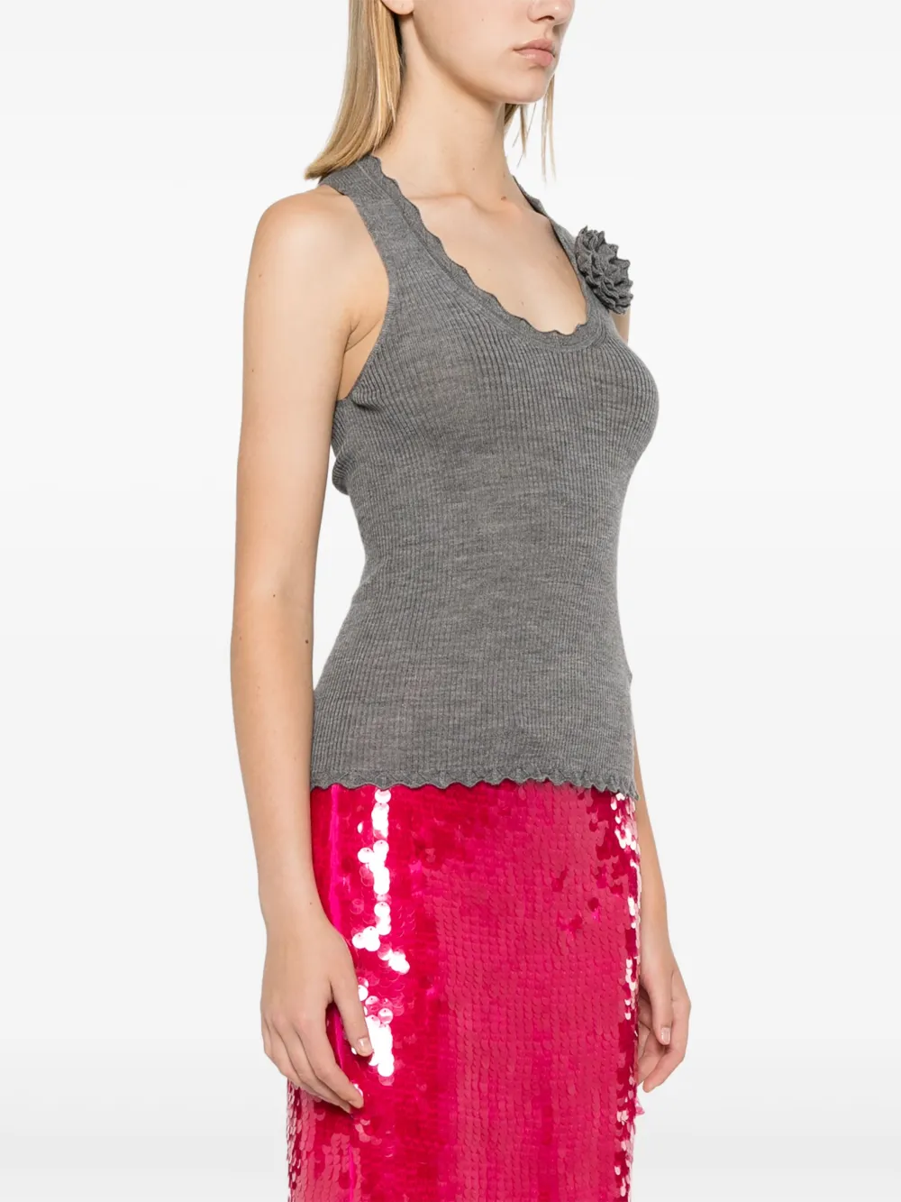 Description: Achieve the peak of effortless luxury with this Floral-Appliqué Knitted Tank. Defined by its radiant graphite hue and premium high-fidelity knit fabrication this piece offers an authoritative and creative take on modern archival essential wear. The design features a provocative fitted profile and structural romantic appliqués that flow into a precision-engineered silhouette. Crafted with structural integrity and a technical high-fidelity finish it maintains a sharp aesthetic while the specialized floral detail adds a unique designer dimension.