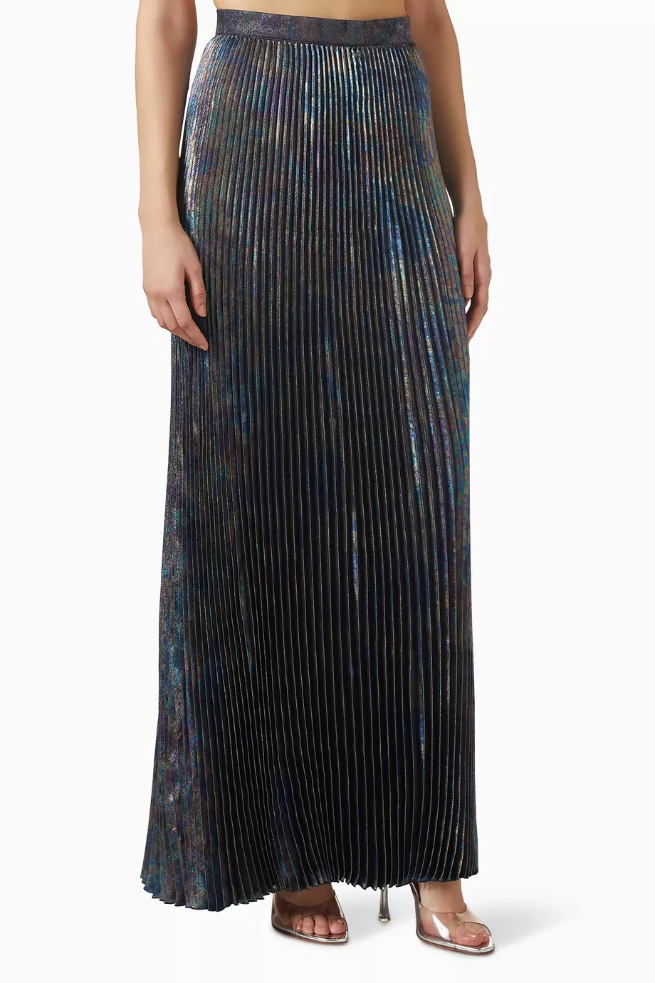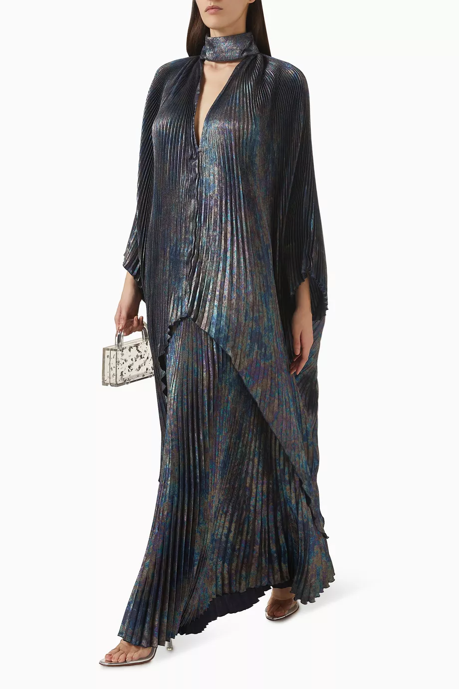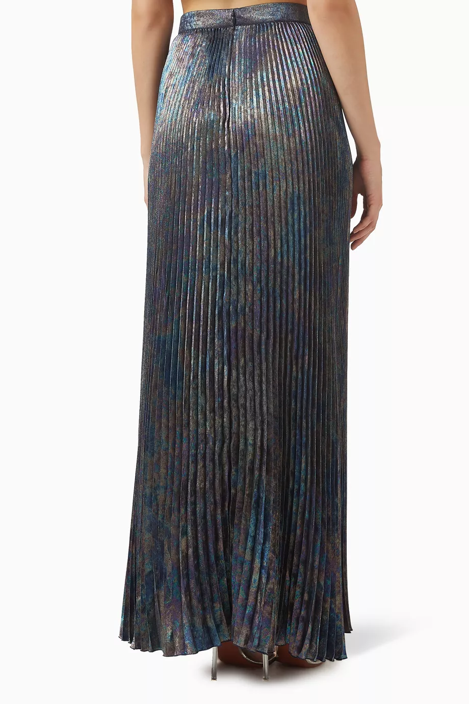 Features: Technical high-shine fabric; Structural permanent pleats; High-fidelity flowing movement; Precision tailored waistband