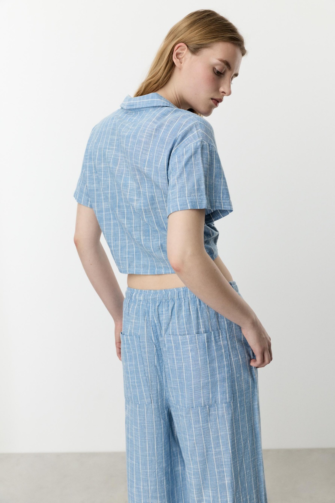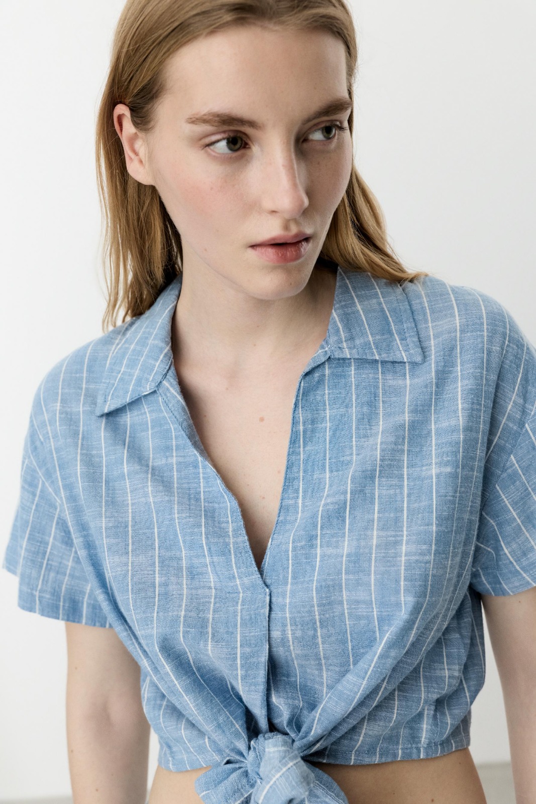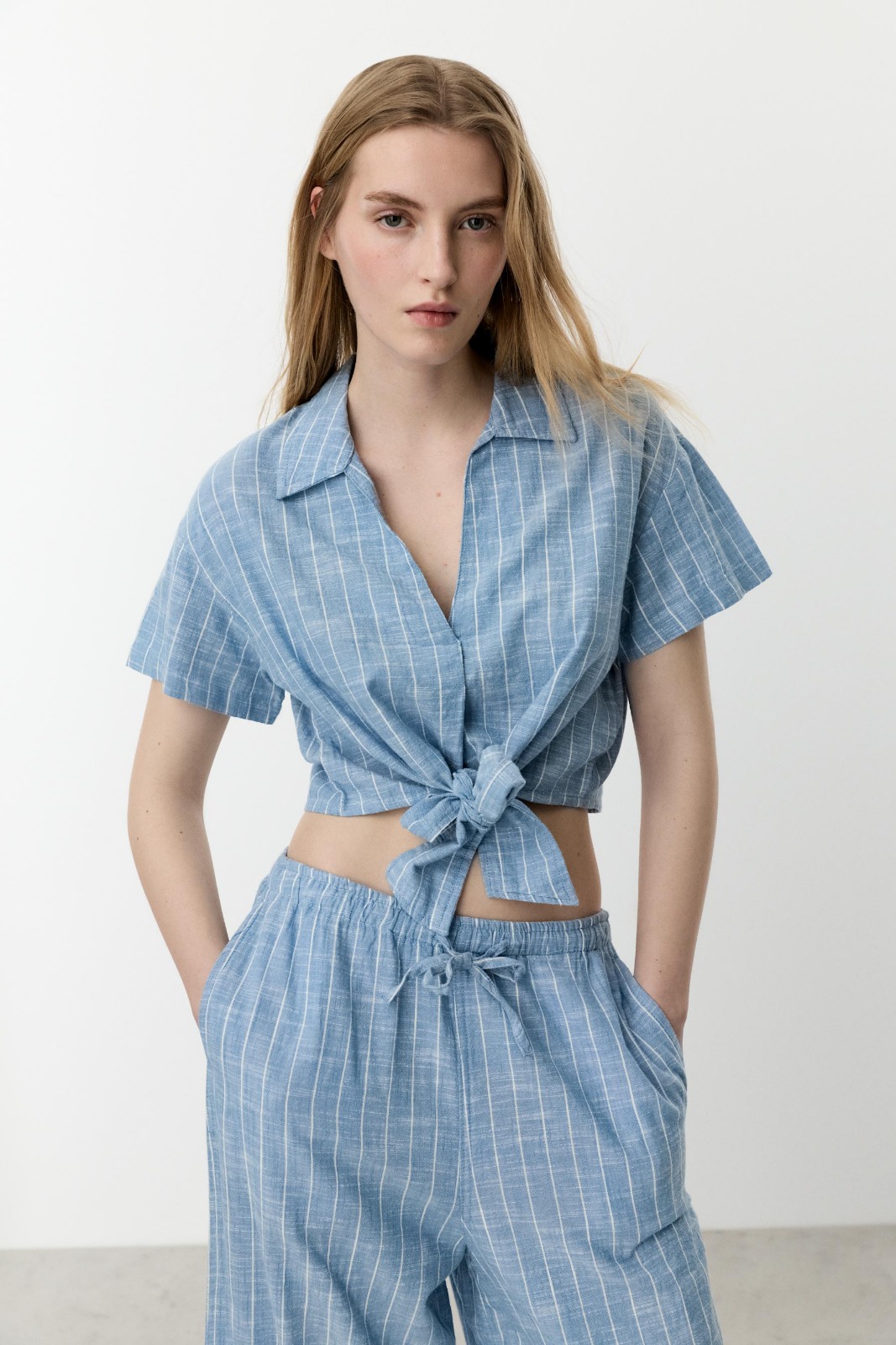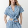 Features: Technical cotton denim; Structural front knot; High-fidelity wash; Precision tailored seams