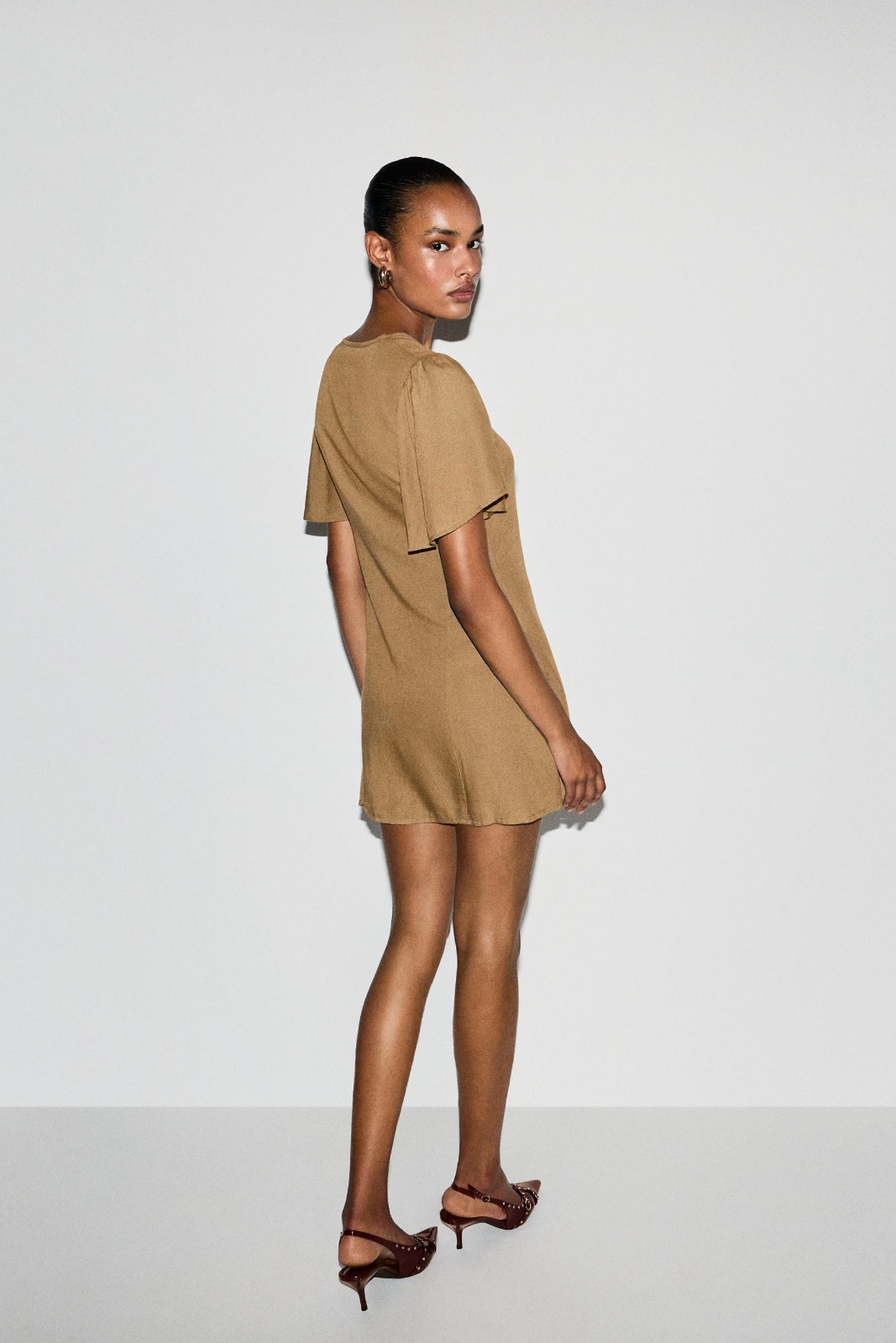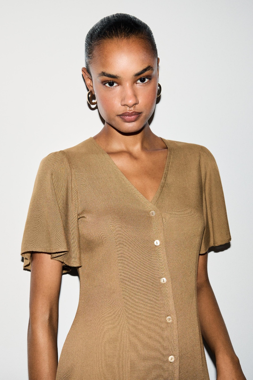 Features: Architectural cape sleeves; Technical button fastening; Structural flounce skirt; High-fidelity rustic fabric