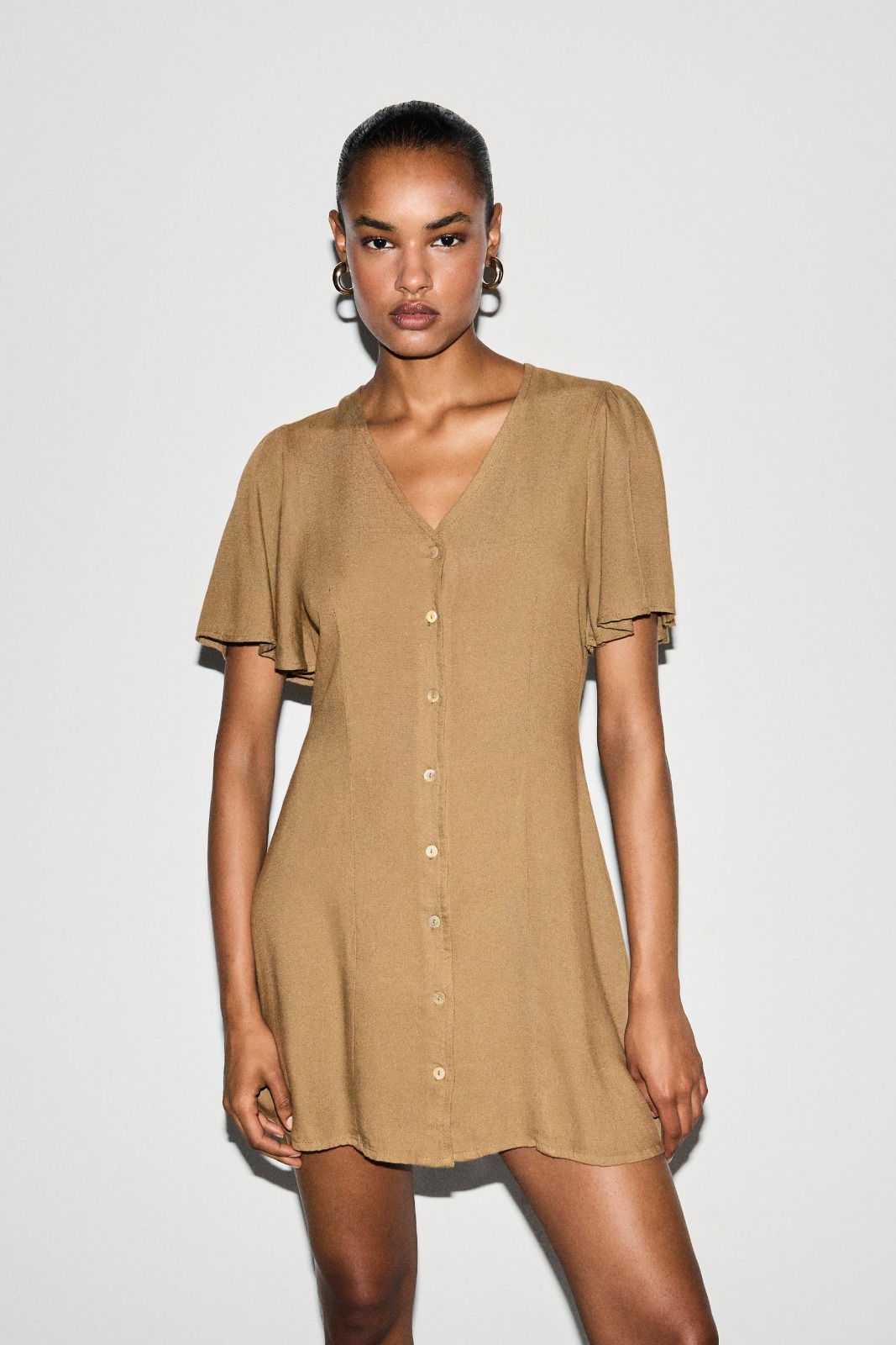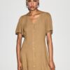 Description: Experience the peak of modern feminine authority with the Khaki Zenith Cape Dress. Defined by its sophisticated khaki palette and premium high-density rustic fabric, this piece offers a statuesque and creative take on contemporary archival evening wear. The architectural construction features provocative short cape sleeves and a precision-fitted body that flows into a structural flounce on the skirt. Crafted with structural integrity and a technical V-neck button fastening, it serves as a timeless foundational statement for a curated high-fashion short dresses wardrobe.