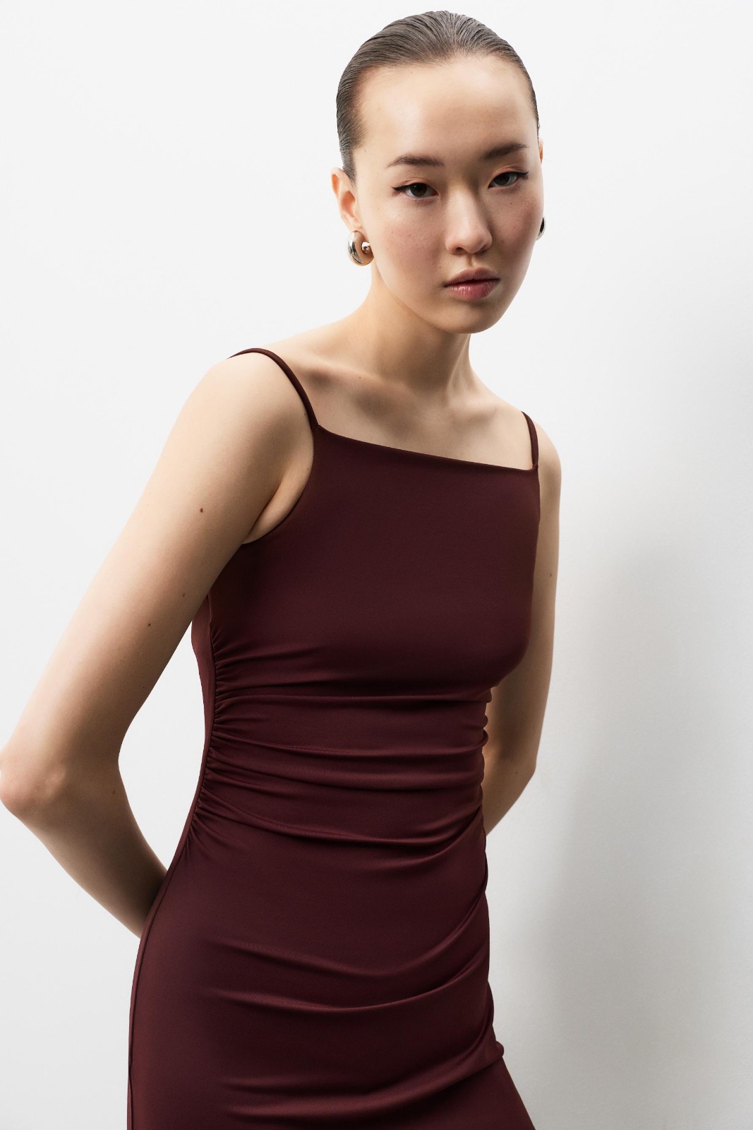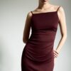 Description: Achieve the peak of effortless high-fashion luxury with the Maroon Monarch Waterfall Dress. Defined by its radiant maroon hue and premium high-fidelity stretchy polyamide fabric, this piece offers an authoritative and creative take on modern archival gala wear. The architectural design features provocative thin straps and structural waterfall neckline detailing that flows into a precision-engineered fitted silhouette. Crafted with a statuesque profile and structural integrity, it maintains a sharp aesthetic while the technical polyamide finish adds a unique designer dimension.