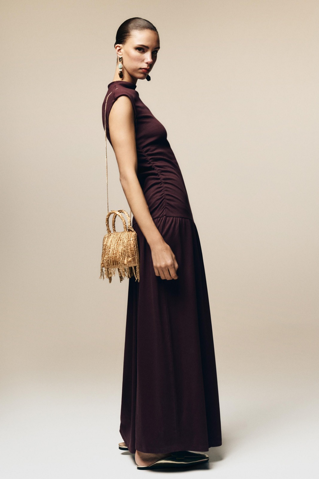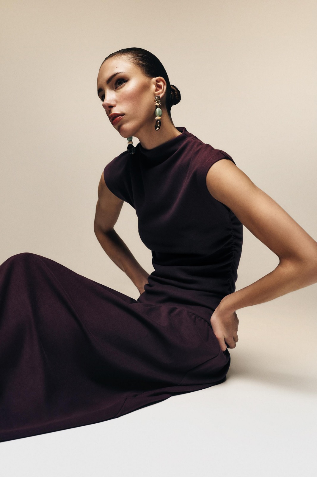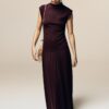 Description: Experience the peak of modern feminine authority with the Maroon Zenith Gathered Dress. Defined by its sophisticated maroon palette and premium high-density stretchy cotton fabric, this piece offers a statuesque and creative take on contemporary archival evening wear. The architectural construction features provocative gathering at the waist and a structural elasticated waistband that ensures exceptional movement while maintaining a polished designer aesthetic. Crafted with structural integrity and a technical slightly raised neckline, it serves as a timeless foundational statement for a curated high-fashion midi dresses wardrobe.