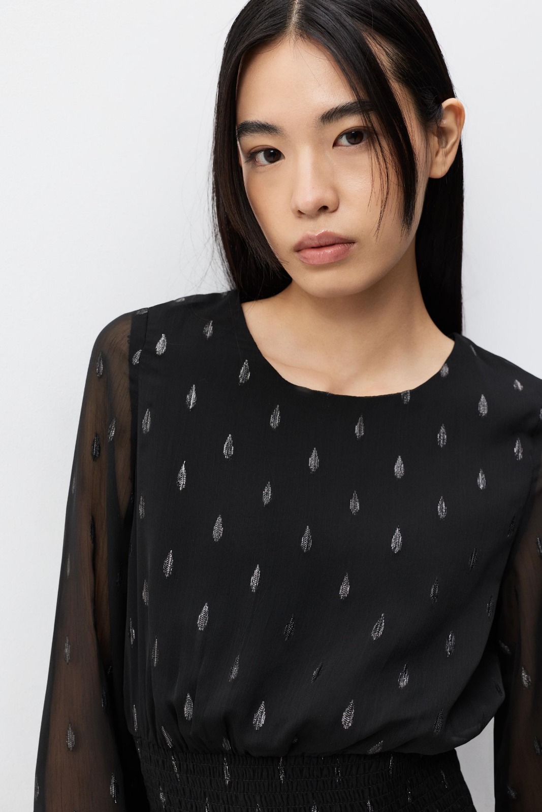 Features: Architectural metallic print; Technical elastic waist; Structural sheer sleeves; High-fidelity flowing fabric