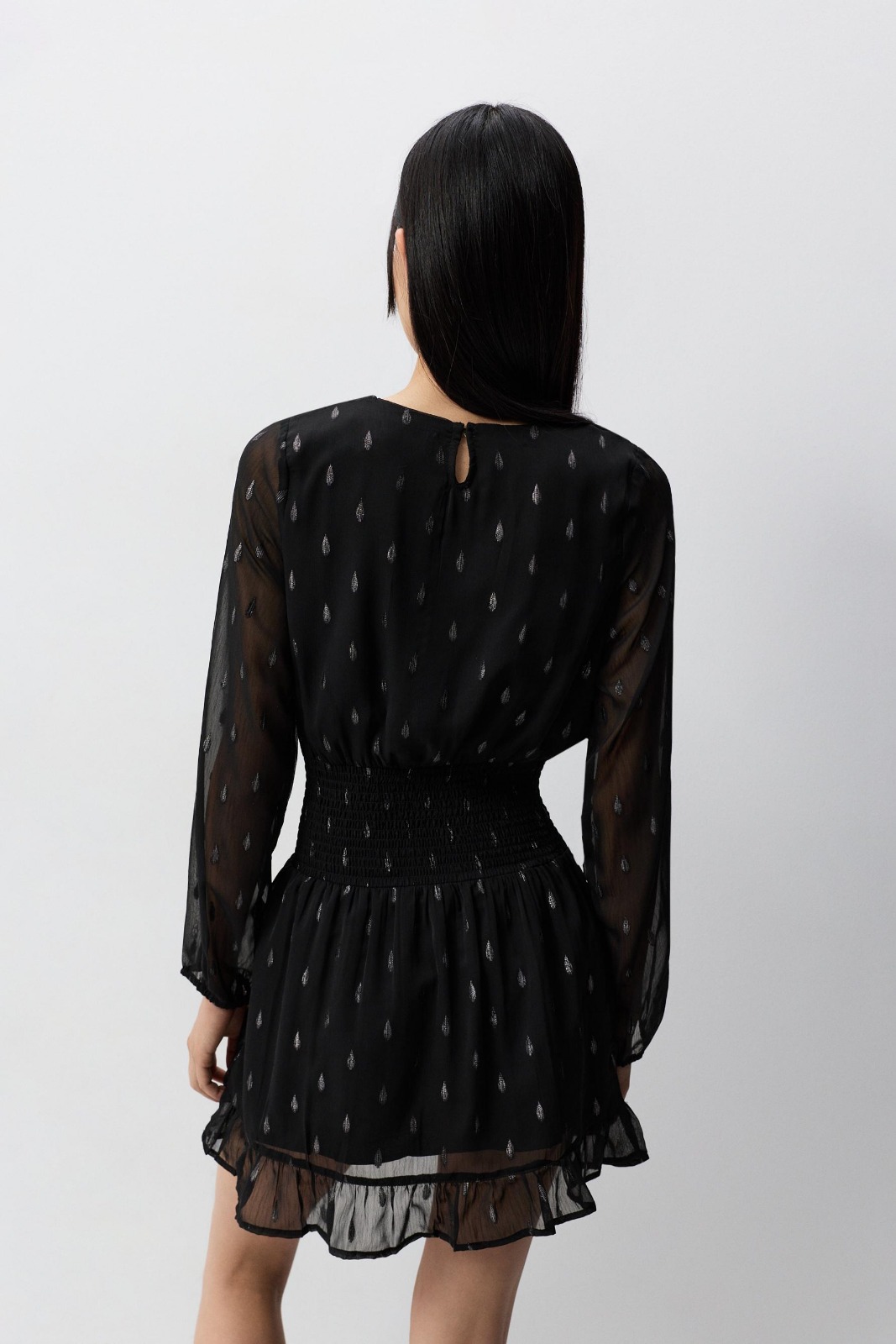 Description: Capture the energetic spirit of modern luxury with the Midnight Archive Metallic Dress. Characterized by its unique architectural silhouette and sophisticated black palette with metallic print, this piece offers a statuesque and creative take on artisanal evening tailoring. The construction features provocative slightly sheer long sleeves and a refined technical elasticated waist that ensures a polished aesthetic for high-profile social retreats. Crafted from premium high-density flowing fabric with structural integrity and a fluid modern profile, it maintains a sharp and authoritative aesthetic while the round neck button fastening adds a tactile designer edge.