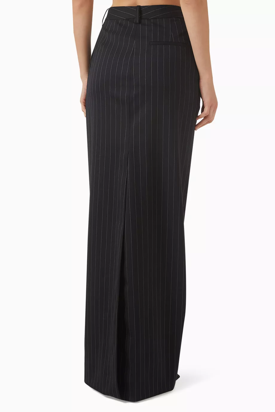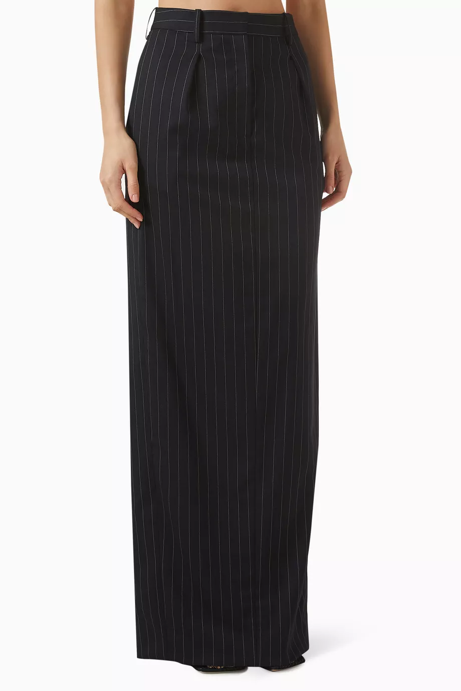 Description: Achieve the peak of effortless high-fashion luxury with the Navy Monarch Maxi Skirt. Defined by its radiant navy pinstripe palette and premium high-fidelity fabrication, this piece offers an authoritative and creative take on modern archival formal wear. The architectural design features provocative high-waisted pleated construction and structural pinstripe detailing that flows into a precision-engineered full-length silhouette designed to create a strong, elongated line. Crafted with a statuesque profile and structural integrity, it maintains a sharp aesthetic while the technical pinstripe finish delivers controlled elegance for formal and workwear styling.