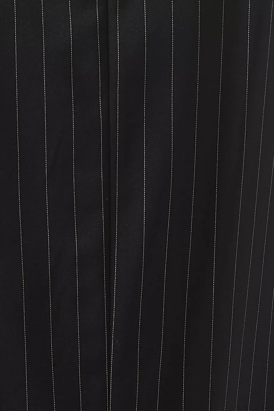 Features: Architectural high-waisted pleats; Technical pinstripe detail; Structural elongated line; High-fidelity tailoring