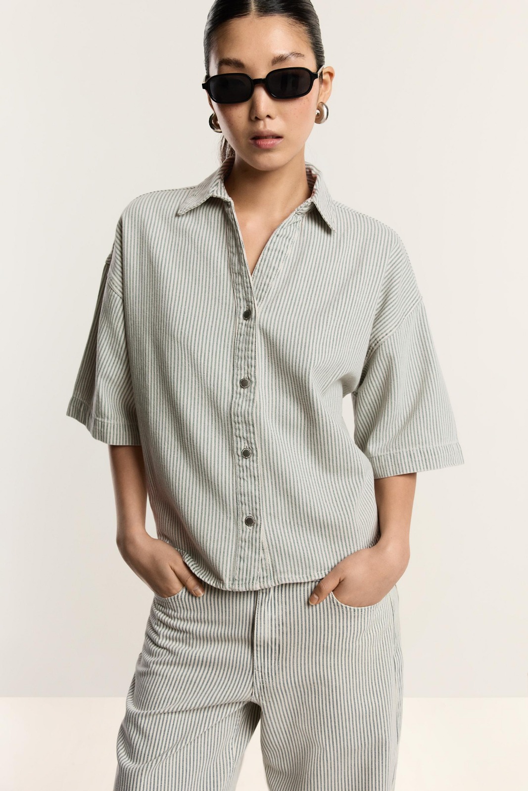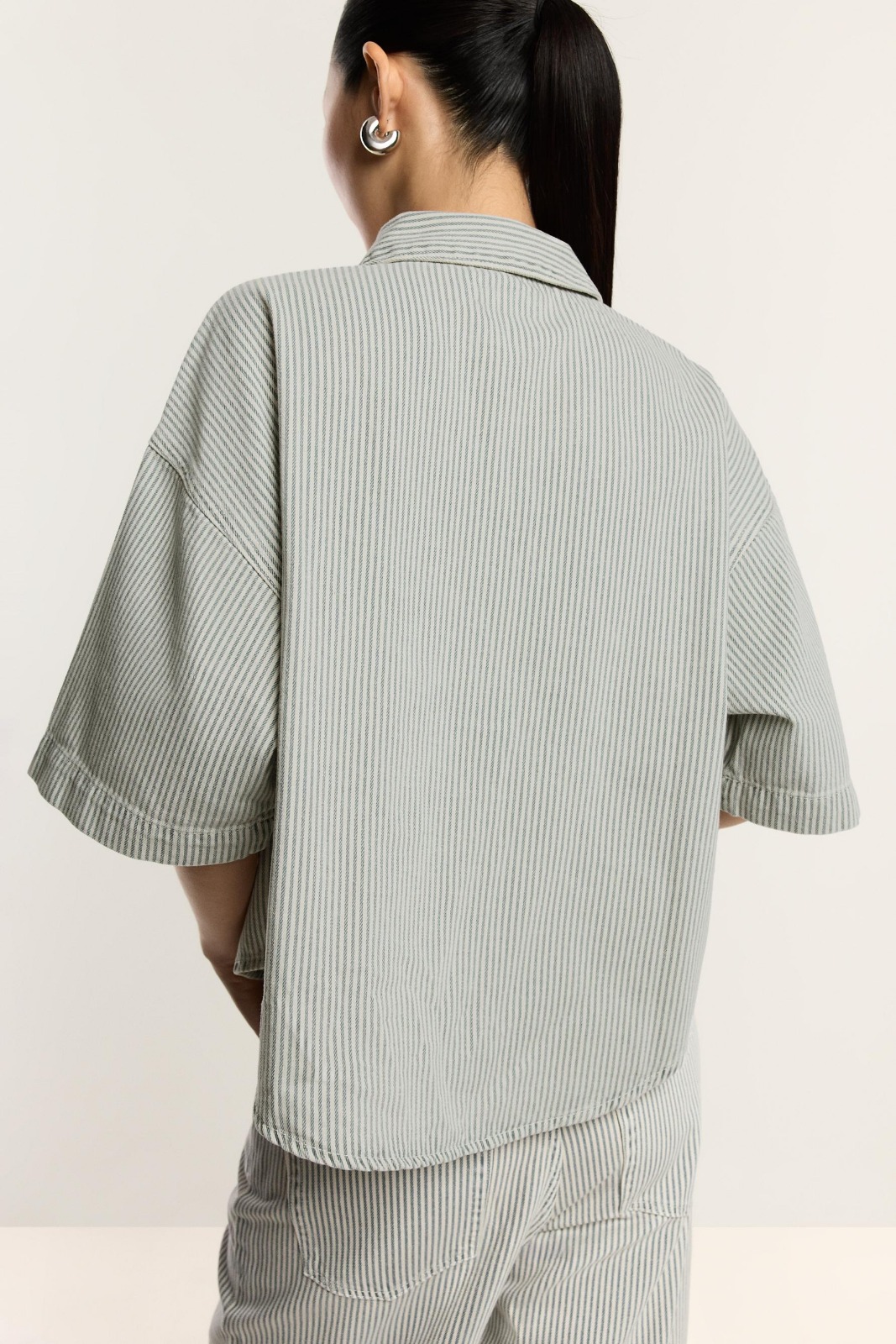 Features: Technical cotton denim; Structural stripe pattern; High-fidelity metal buttons; Precision tailored hem