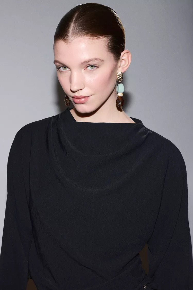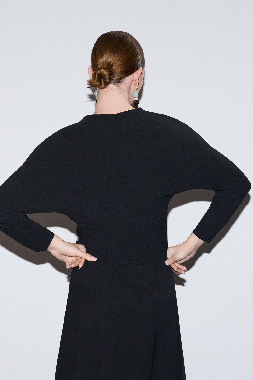 Description: Achieve the peak of effortless high-fashion luxury with the Onyx Monarch Wraparound Top. Defined by its radiant jet black hue and premium high-fidelity fluid fabric, this piece offers an authoritative and creative take on modern archival evening wear. The architectural design features provocative wraparound detailing at the neck and structural zip fastenings at the back that flow into a precision-engineered fitted silhouette. Crafted with a statuesque round neck and structural integrity, it maintains a sharp aesthetic while the technical fluid finish adds a unique designer dimension. Its bold structural profile serves as a timeless statement of refined luxury for the curated modern wardrobe.