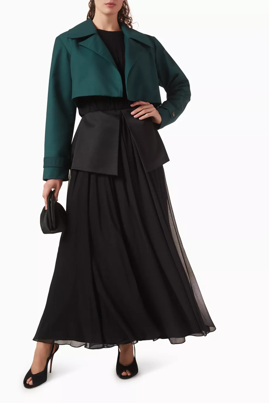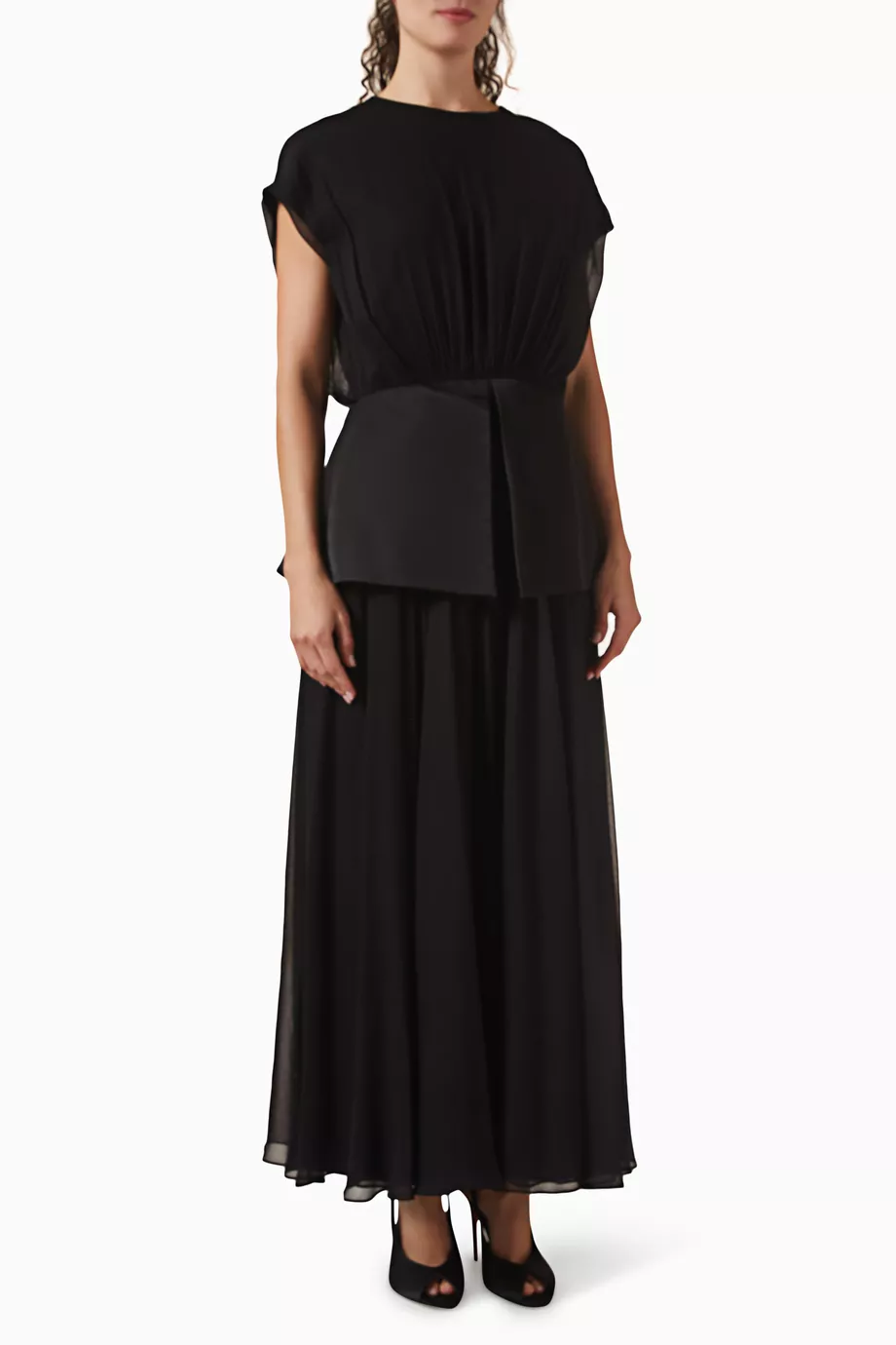 Features: Technical woven chiffon; Structural peplum waist; High-fidelity flowing hem; Precision tailored seams