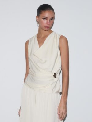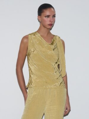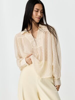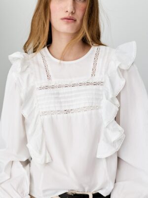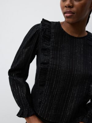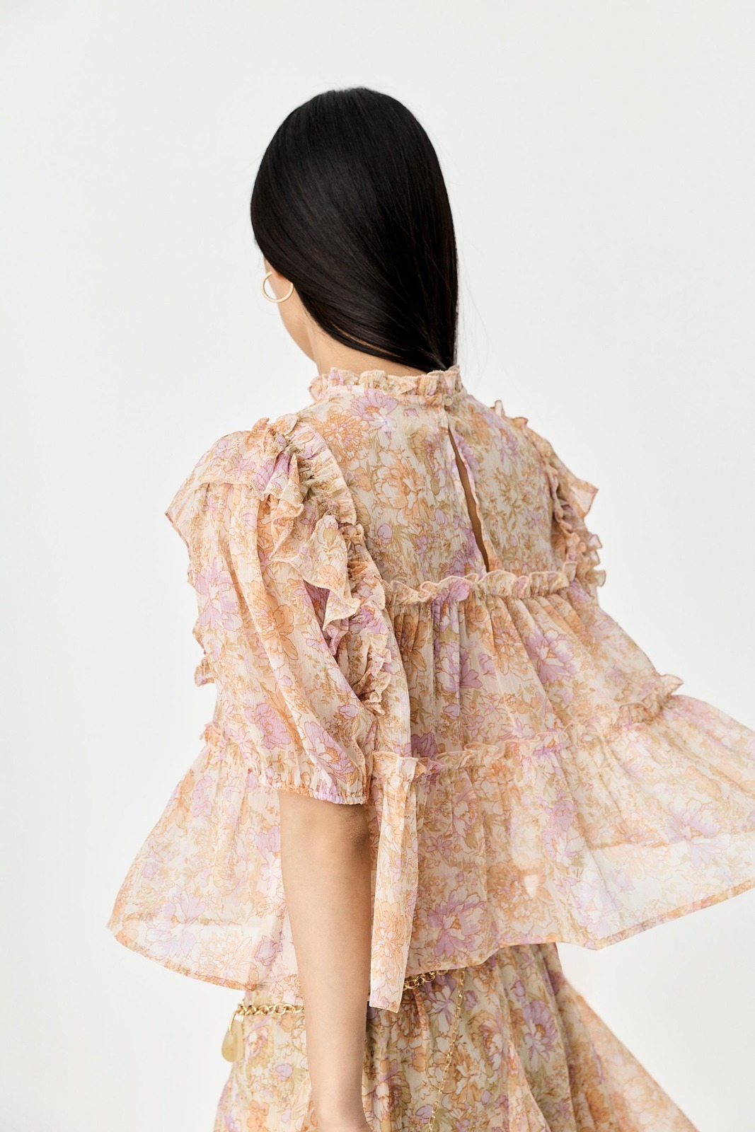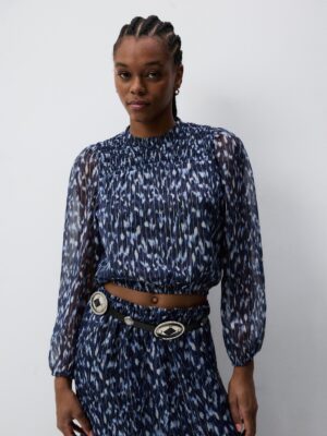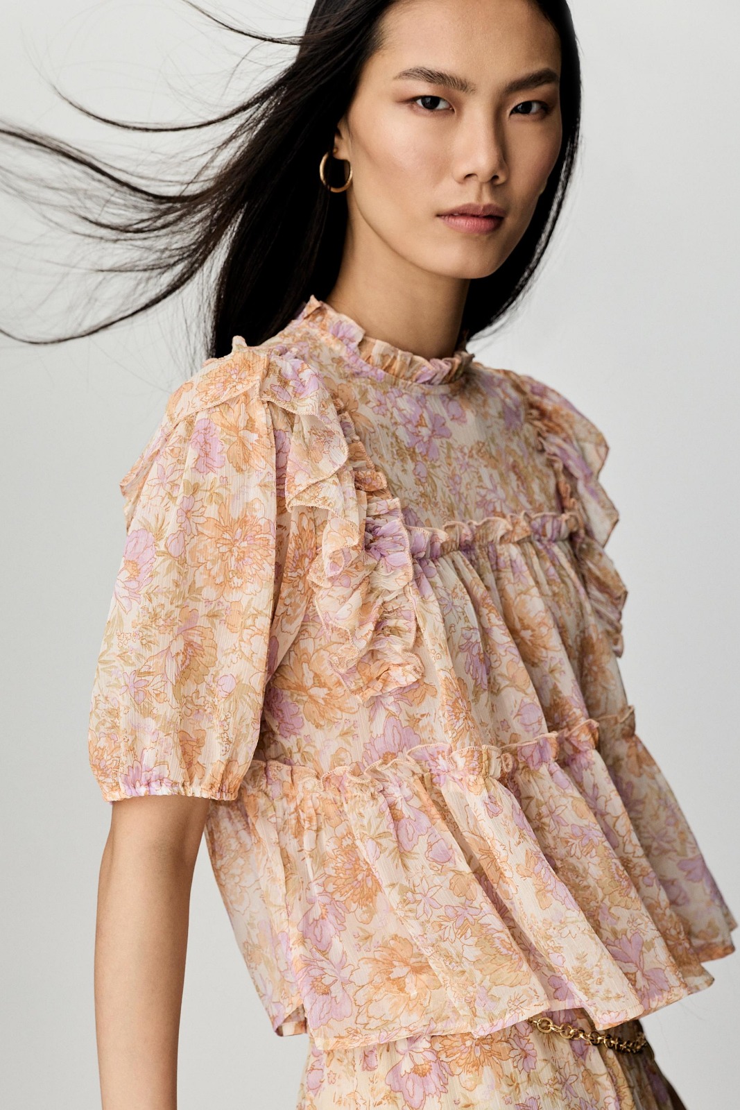 Features: Technical soft-touch weave; Structural sleeve ruffles; High-fidelity vibrant print; Precision tailored cuffs