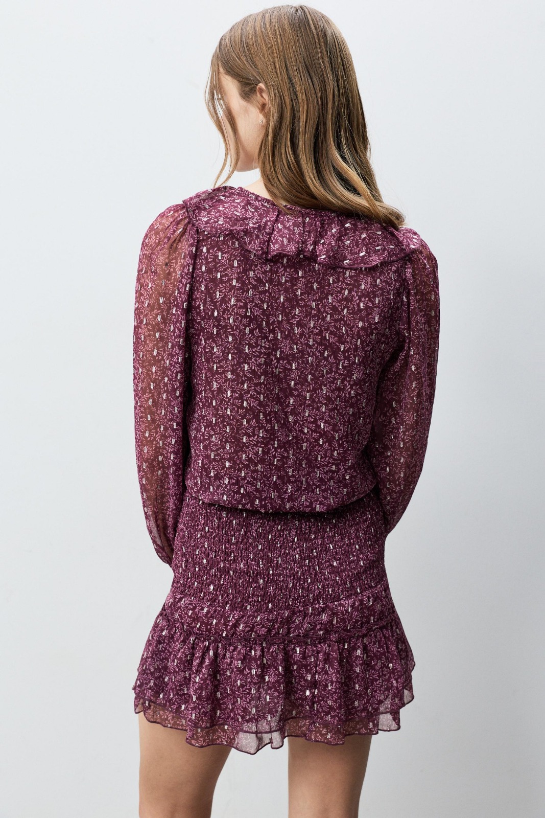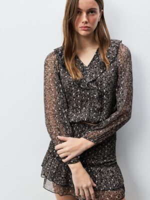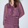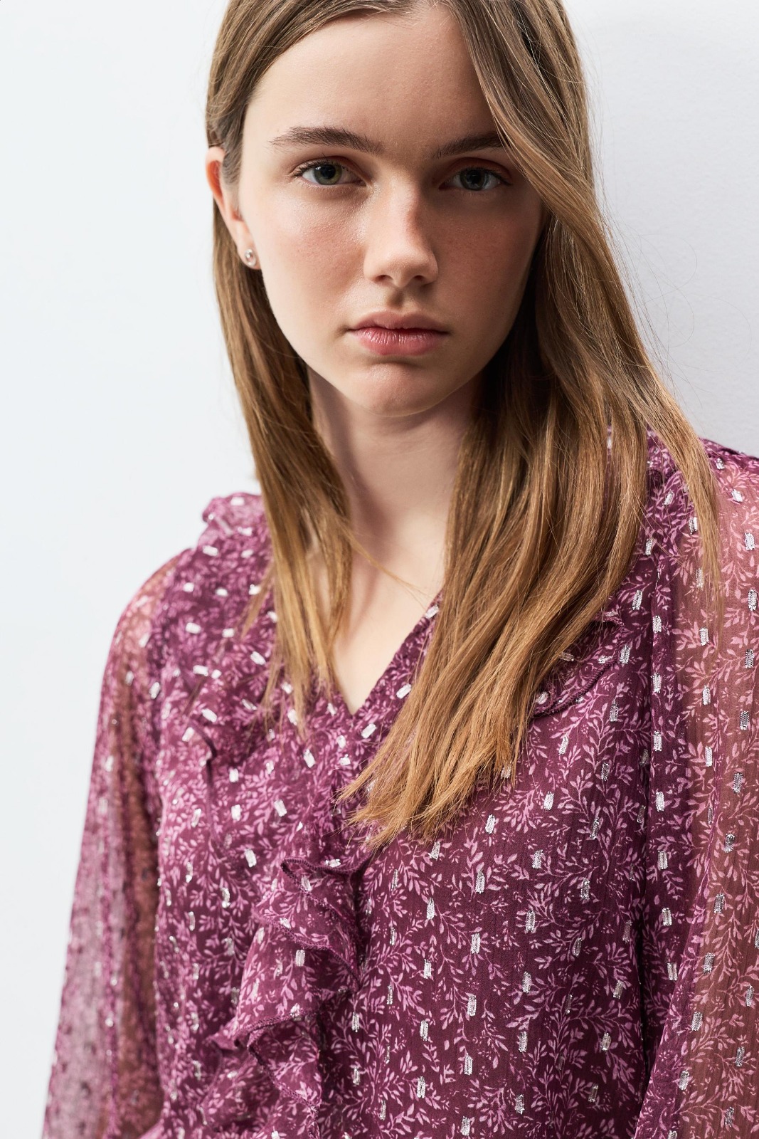 Description: Experience the peak of modern authority with this Metallic Detail Blouse. Defined by its sophisticated berry-toned palette and premium high-fidelity sheer fabrication this piece offers a statuesque and creative take on contemporary archival evening wear. The construction features provocative metallic-print lines and precision-engineered structural V-neck ruffles that ensure exceptional movement while maintaining a polished designer aesthetic. Crafted with structural integrity and a technical high-fidelity finish it serves as a timeless foundational statement for a curated formal collection.