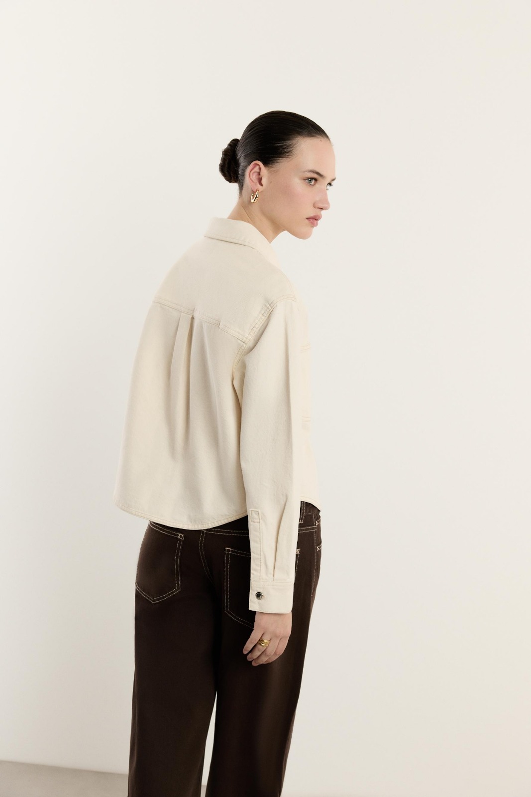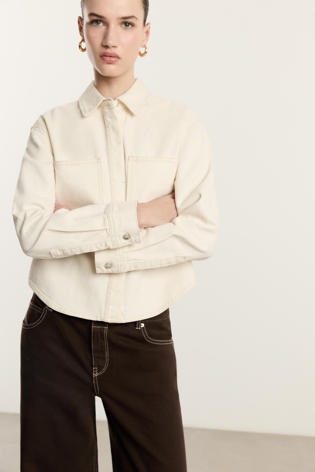 Features: Architectural front pockets; Precise button-flap tailoring; Structural shirt collar; High-fidelity cotton denim