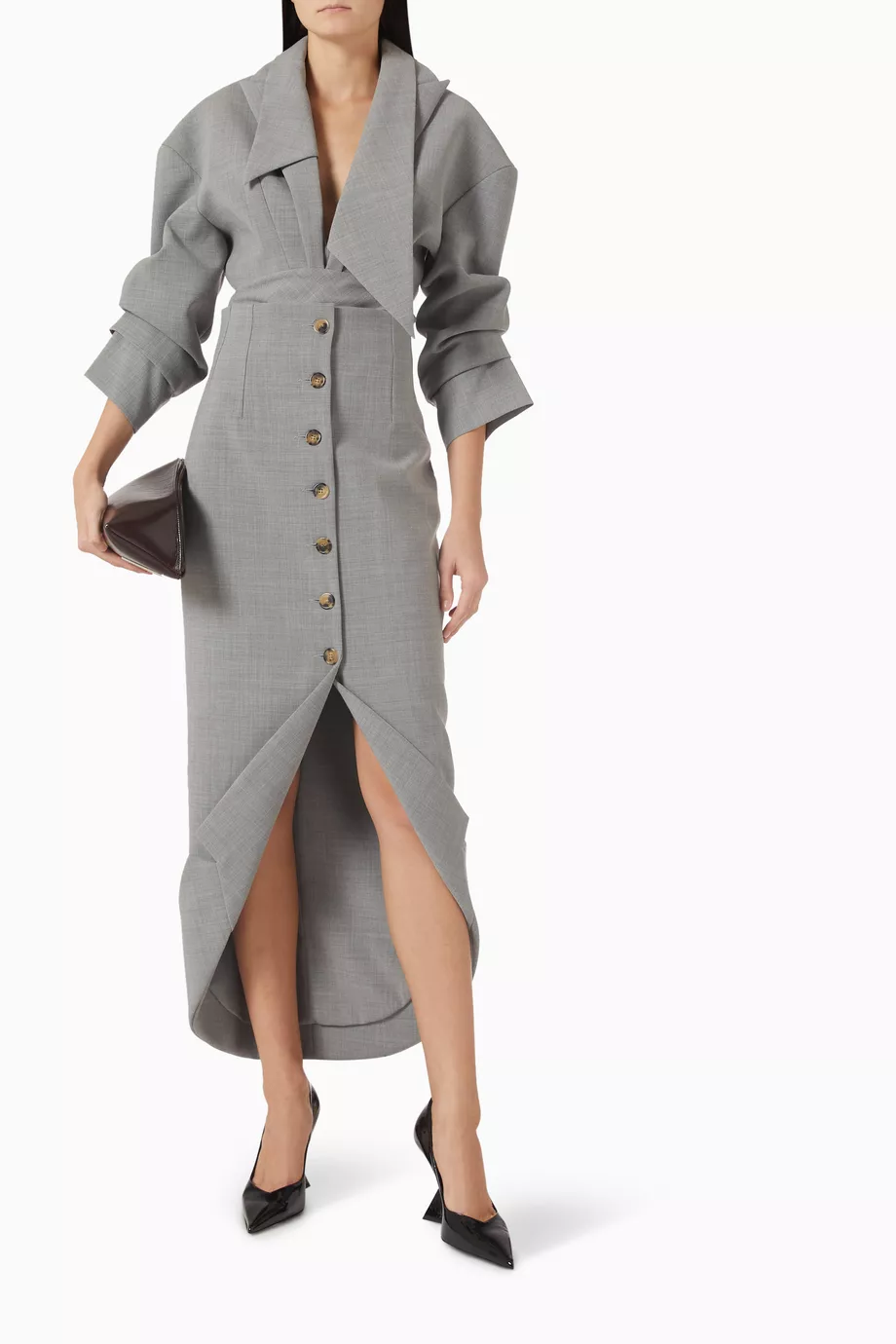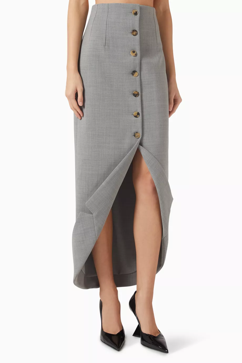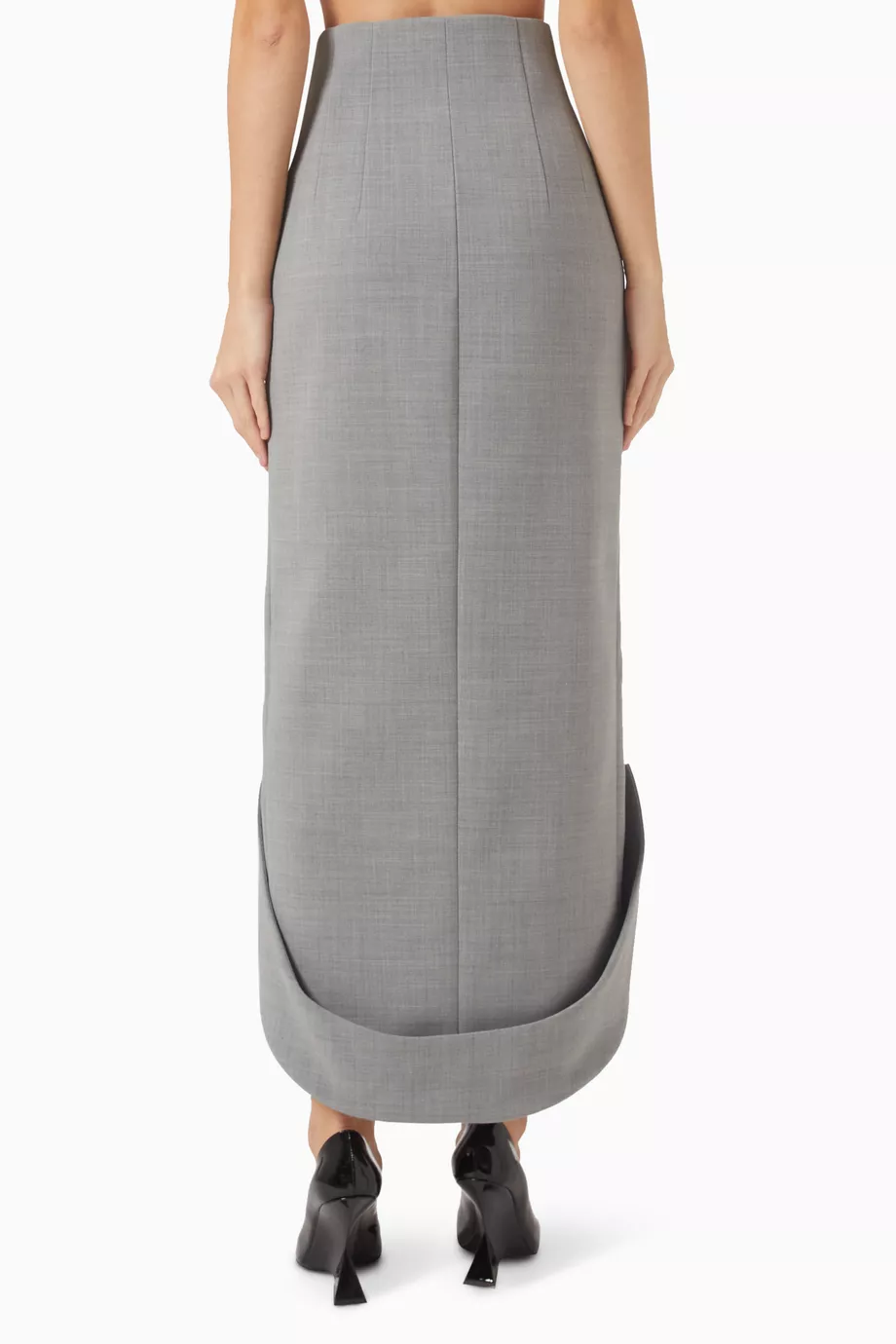 Description: Experience the peak of modern authority with this Tailored Wool-Blend Midi Skirt. Defined by its sophisticated graphite palette and premium high-density fabrication this piece offers a statuesque and creative take on contemporary archival shirting. The construction features provocative high-rise lines and precision-engineered structural elements that ensure exceptional movement while maintaining a polished designer aesthetic. Crafted with structural integrity and a unique jacket-inspired hem it serves as a timeless foundational statement for a curated formal collection.